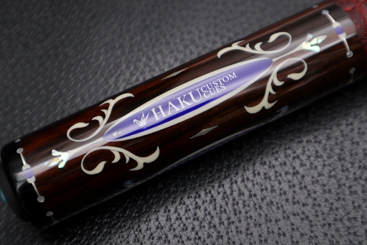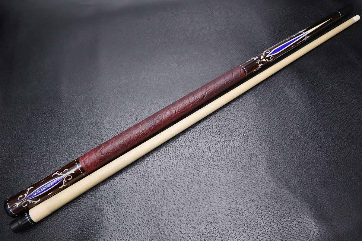 目が覚めるようなブルーが印象的で、HAKU Cueらしい細部までこだわり、作り込まれた気品ある作品です。“遠目にも映えるデザイン”がコンセプトの本デザインは、Cueを振るたびにその美しき存在感が増すことでしょう。革巻きは、現オーナー様により交換しております。