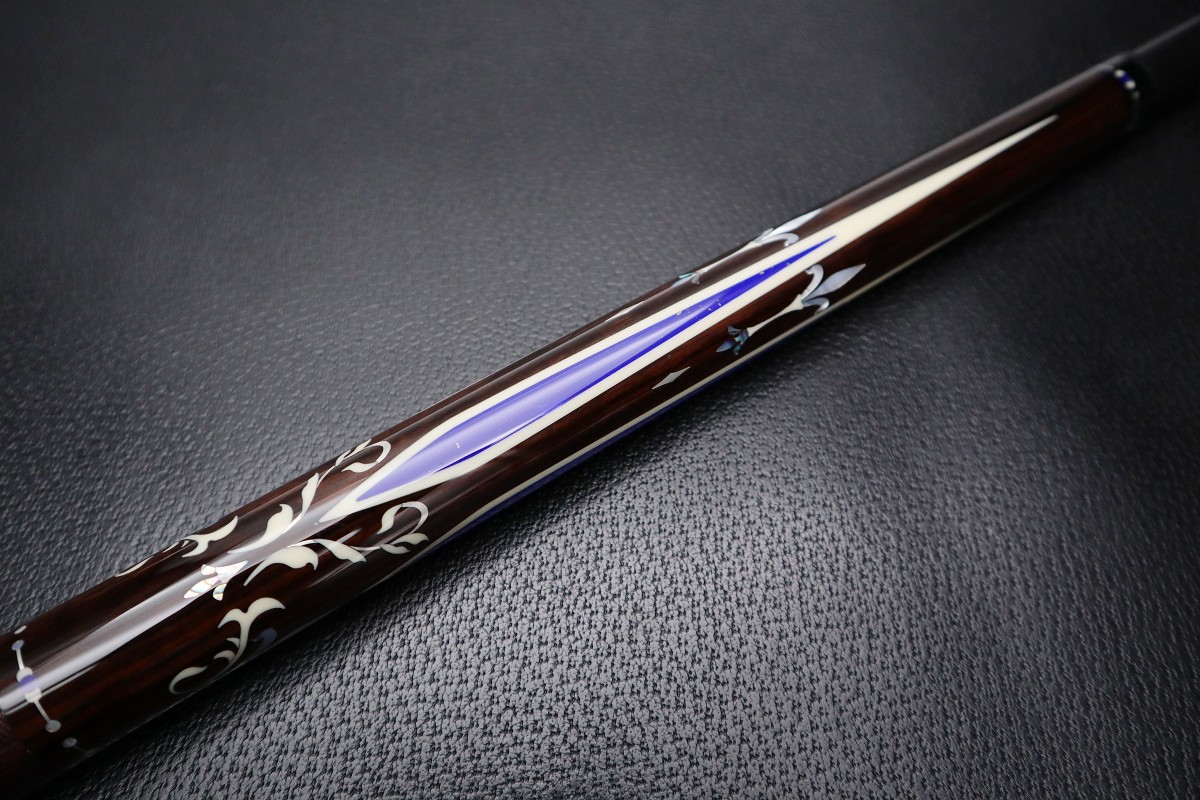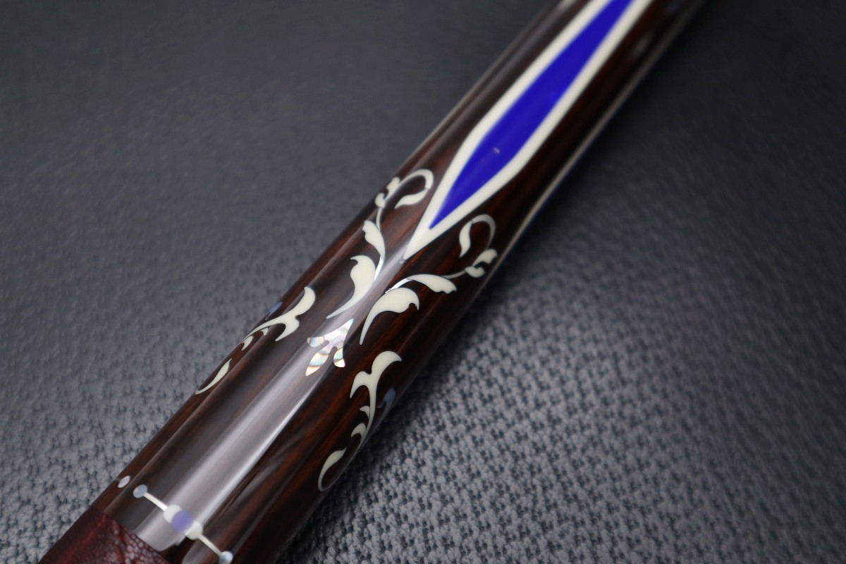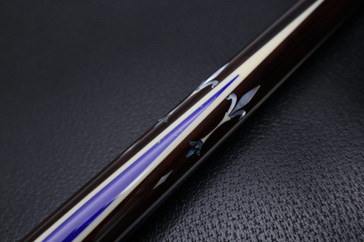 縞黒檀に映えるラピスラズリを起点とした華やぐ“FLEUR DE LIS”の大柄なインレイデザインが優美な彩りを演出しています。堂々とそびえる剣が、遠くから見ても美しく上品です。