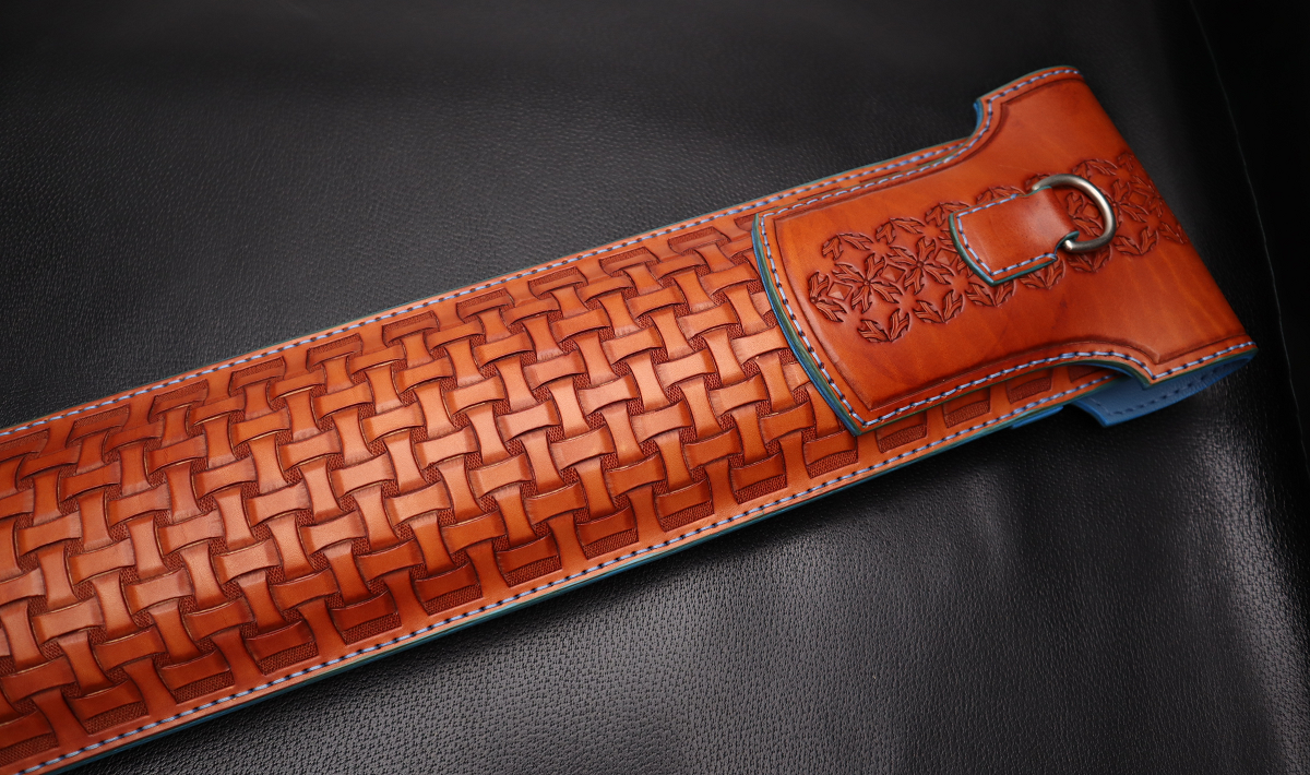 リベット(鋲)を使用せず、全て手縫いで仕立てられている事が特徴です。また、表面や装飾部分に革のハンドカービング(彫刻模様)が施されており、一つ一つ丁寧に作られた作品は長い年月使えるように作られております。