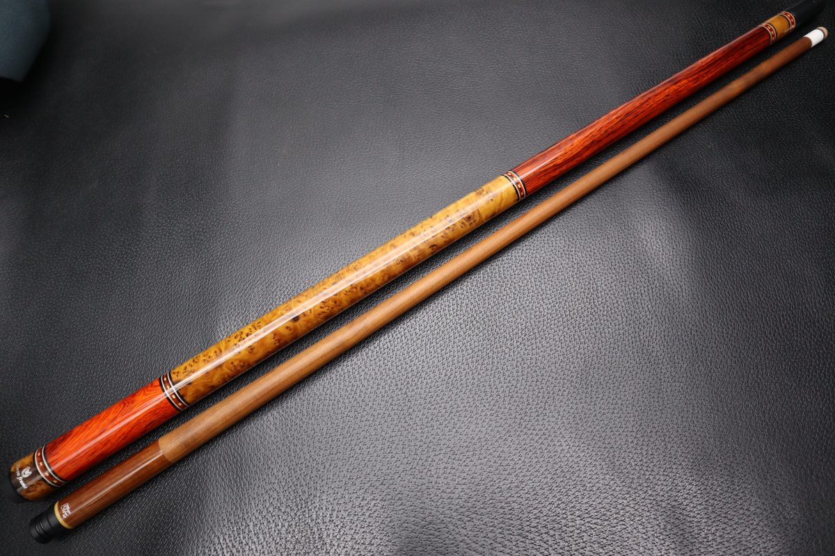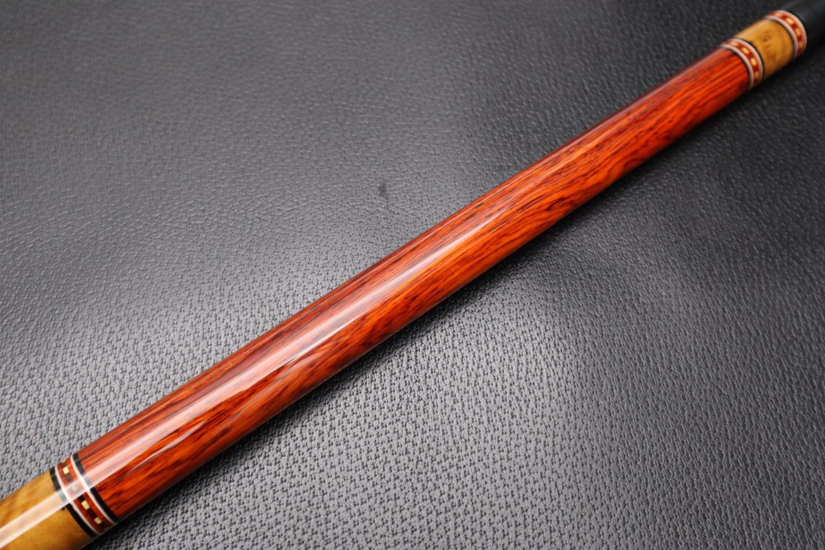 本作品は、新たに新設された京都の工房にて2025年に制作された希少材のココボロ×個性際立つメチークバールの銘木Cueで、ココボロ特有のダイナミックな重厚感とチークバールの繊細な表情が見事に調和しています。