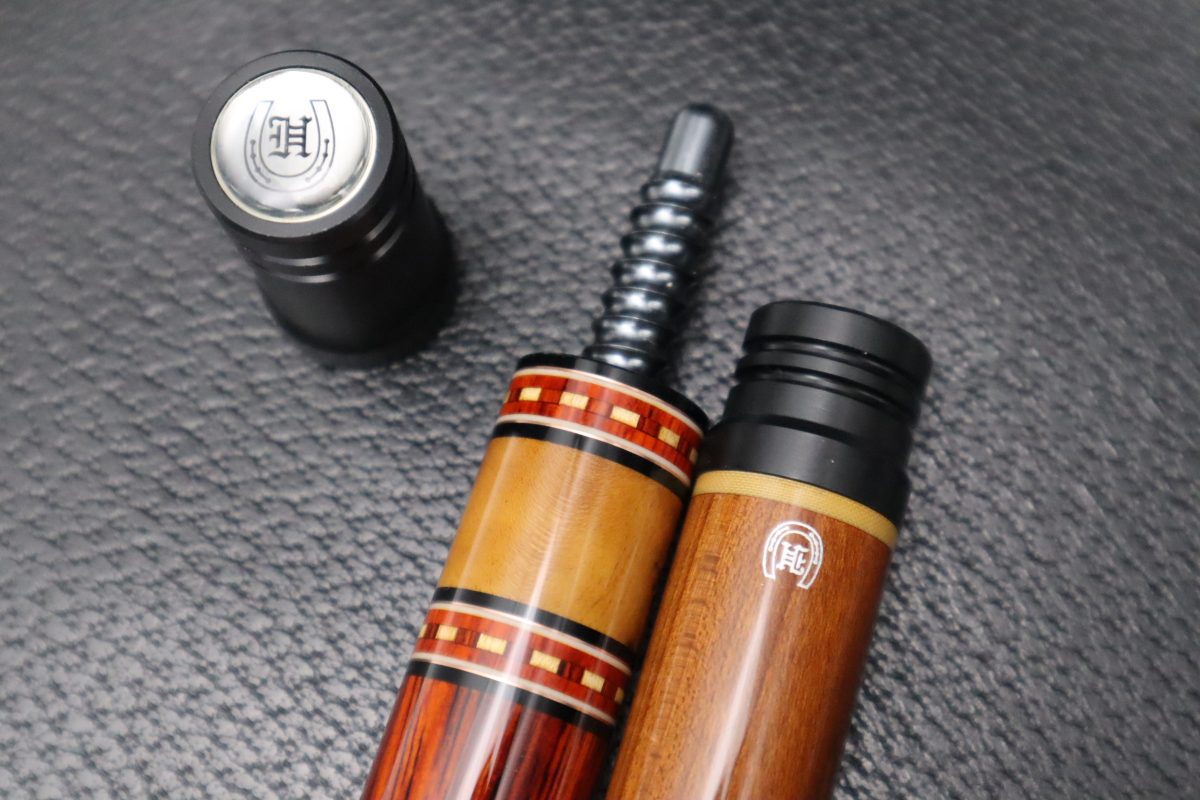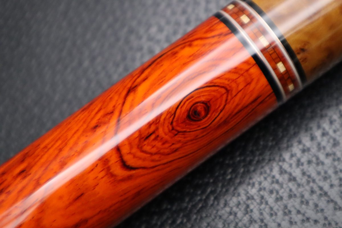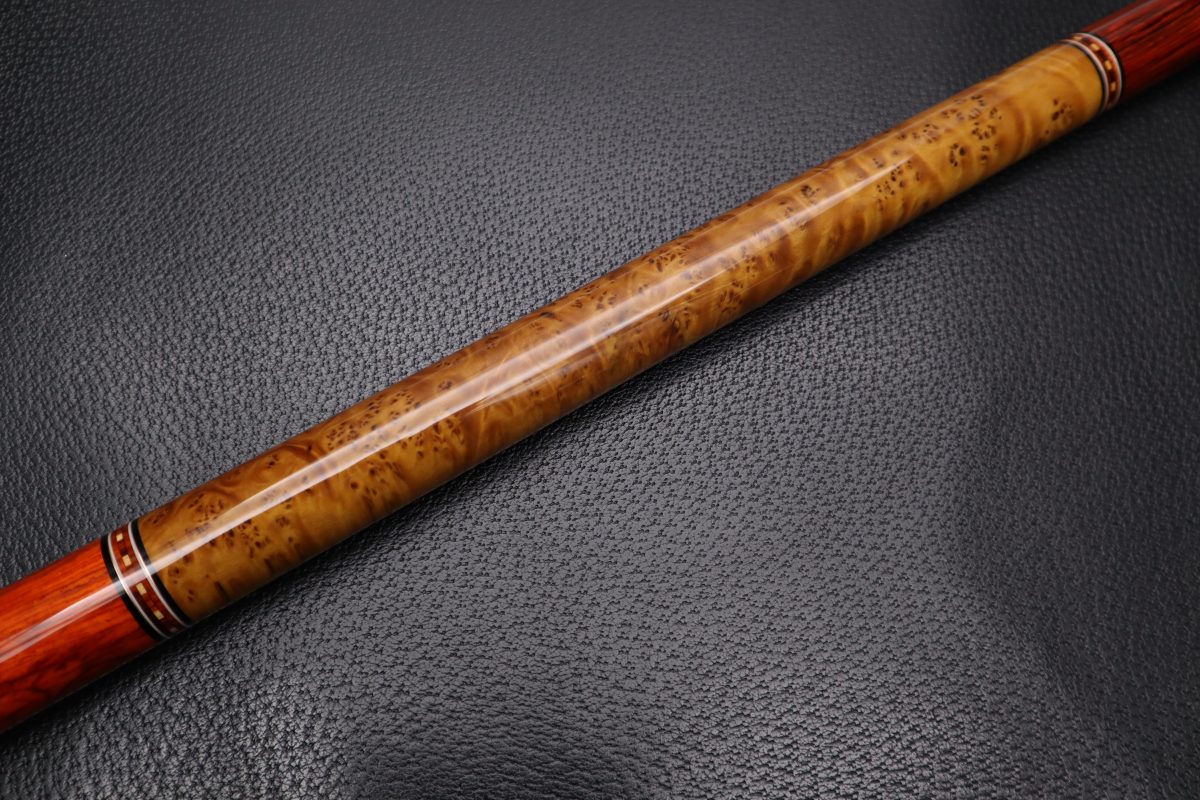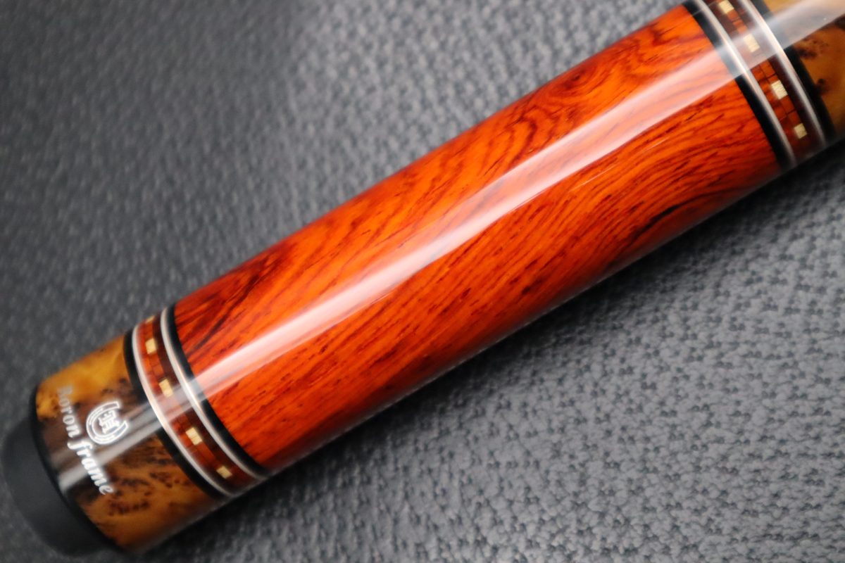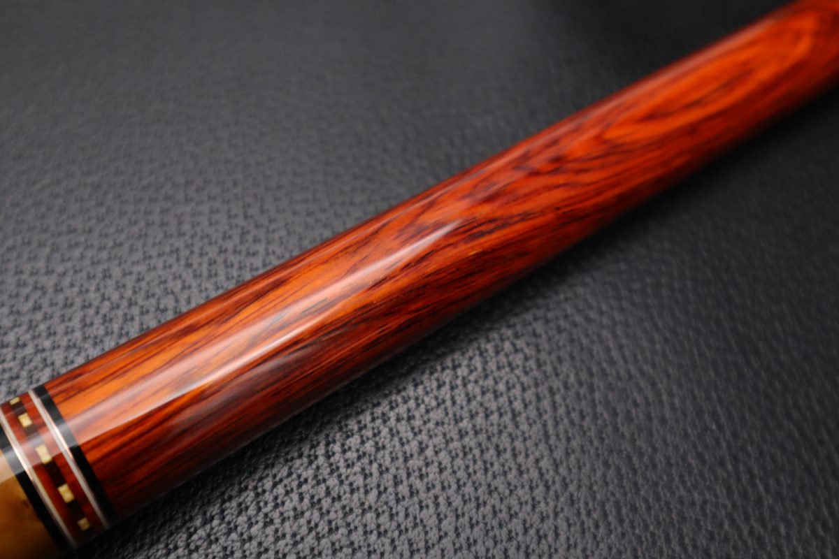 銘木の美しさを楽しむだけでなく、実際のプレイを前提に設計されており、カッパー際立つ繊細なリングがキラリと輝き銘木を引き立てるリングワークなど…素晴らしいMerry widow Cueに仕上がっており。
