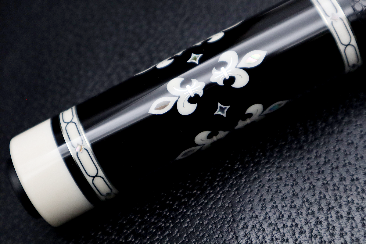 ホワイト×アバロニー×シルバーが光を受けて浮かび上がるコントラストは、深淵のように艶めくエボニーに一層美しく映えます。これぞ!Scepter(王笏)の名にふさわしいハイグレード作品ならではの完成度です。