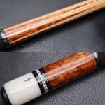 プルーイットの特徴と言える七色に光るアバロニーが散りばめられたリングが贅沢で、シンプルだからこそ剣が映え、その色使いが気品漂う美麗な素晴らしいキューです。インレイドットはシルバー、ダイヤはシェルパールです。画像では伝えにくいですが、エボニー本来の木目が見事にキュー全体を取りまとめています。素晴らしい。。。至極の逸品です。